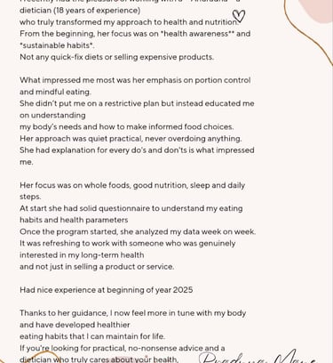 ”Hi Anuradha ma’am, just wanted to say a big thank you! It’s been a month since I started following your guidance, and I’m already feeling so much better. I’ve lost about 3-4 inches, my bloating has come down, cravings are almost gone, and I feel light and active throughout the day. I can now walk 10,000–12,000 steps easily and actually enjoy it! Looking forward to the next 2-3 months with you and excited for more positive changes ahead.”